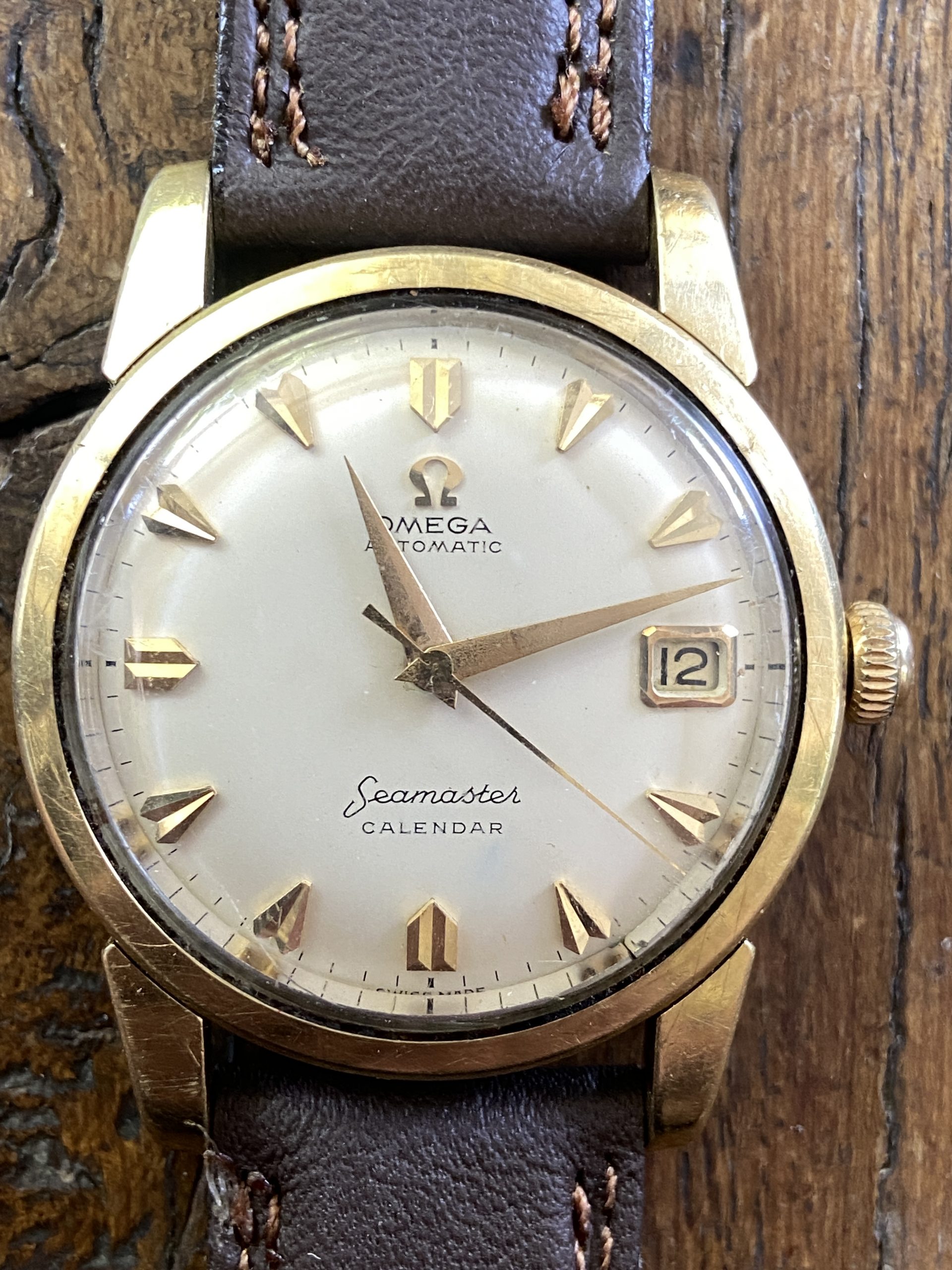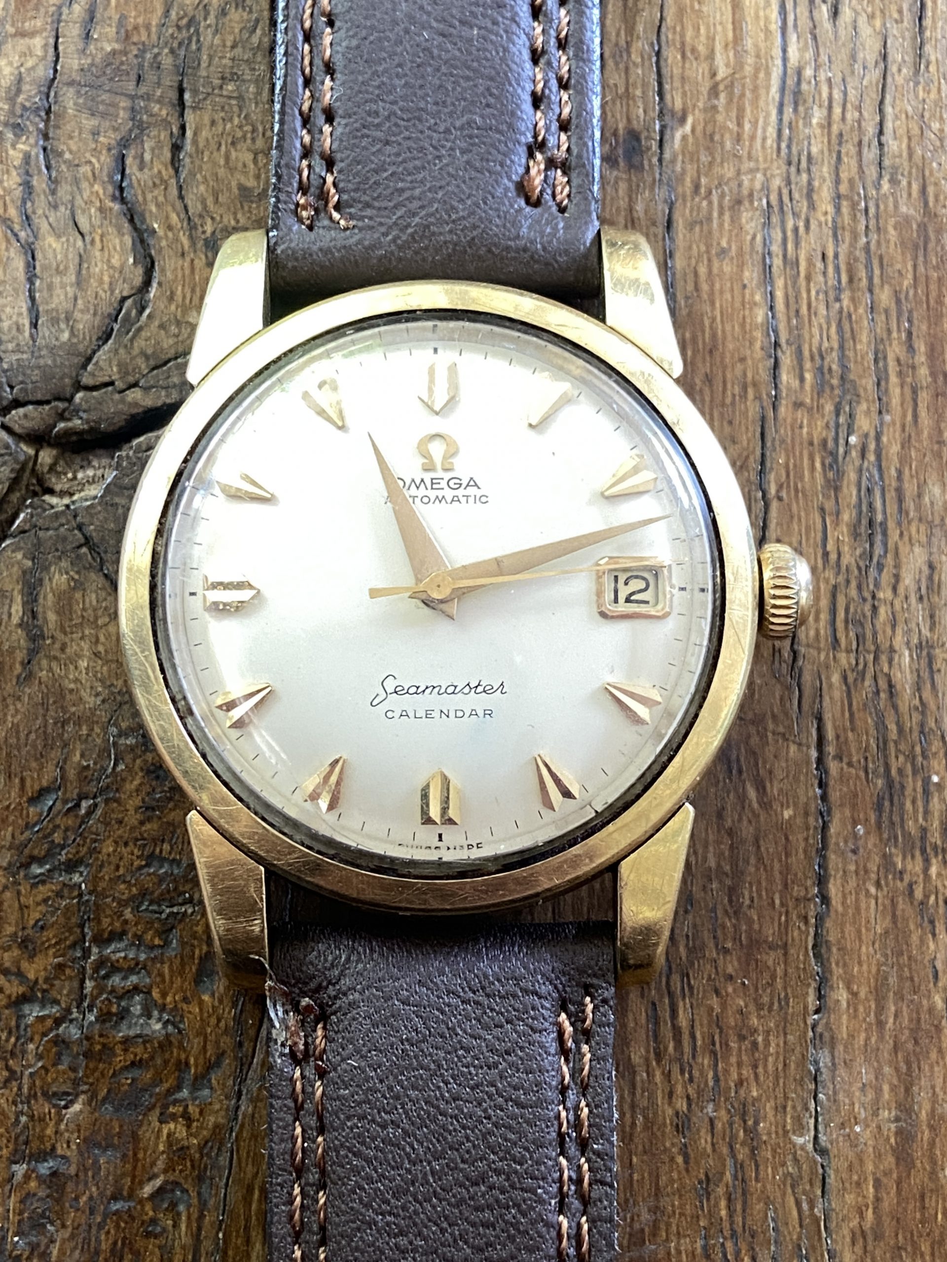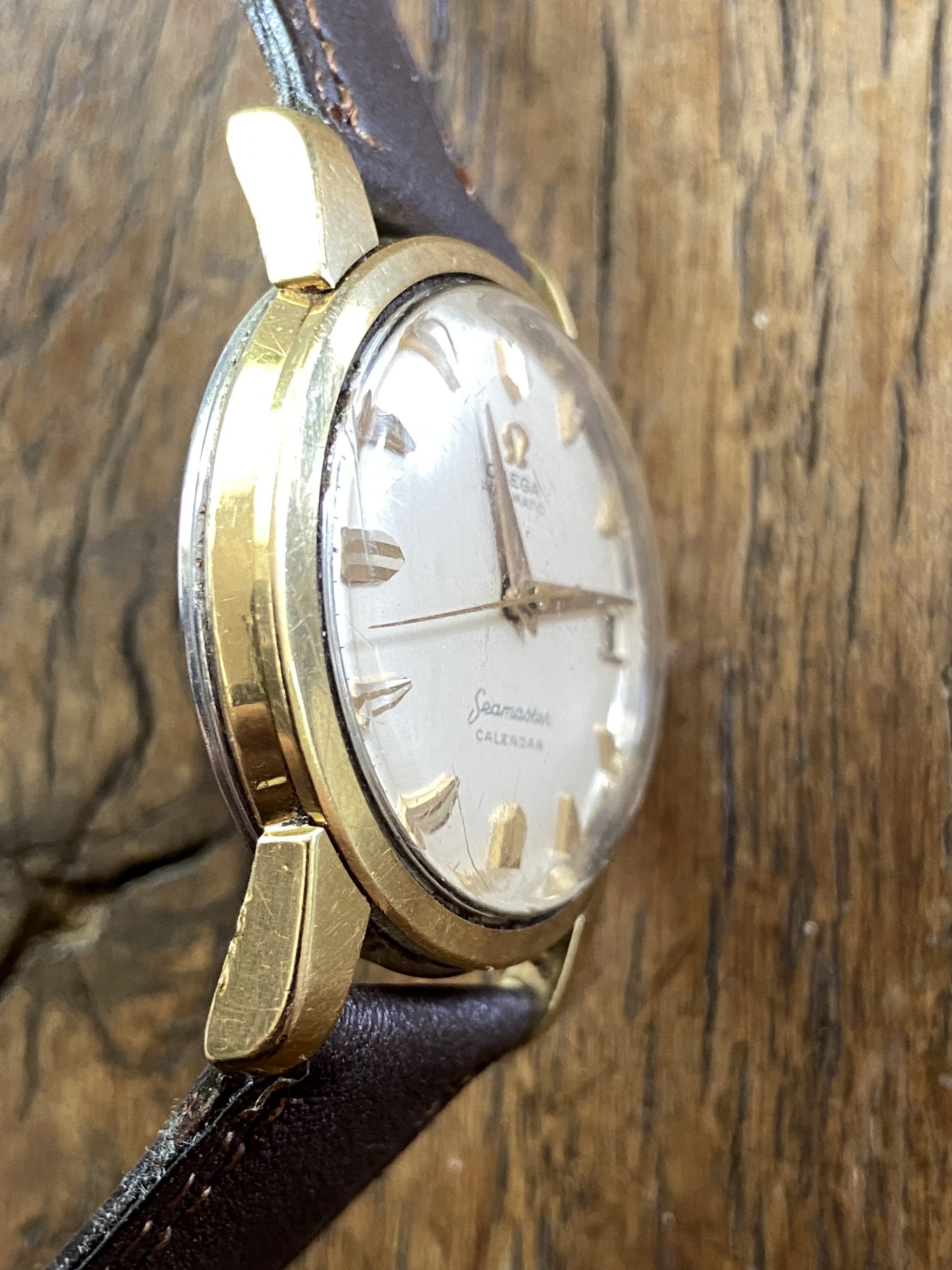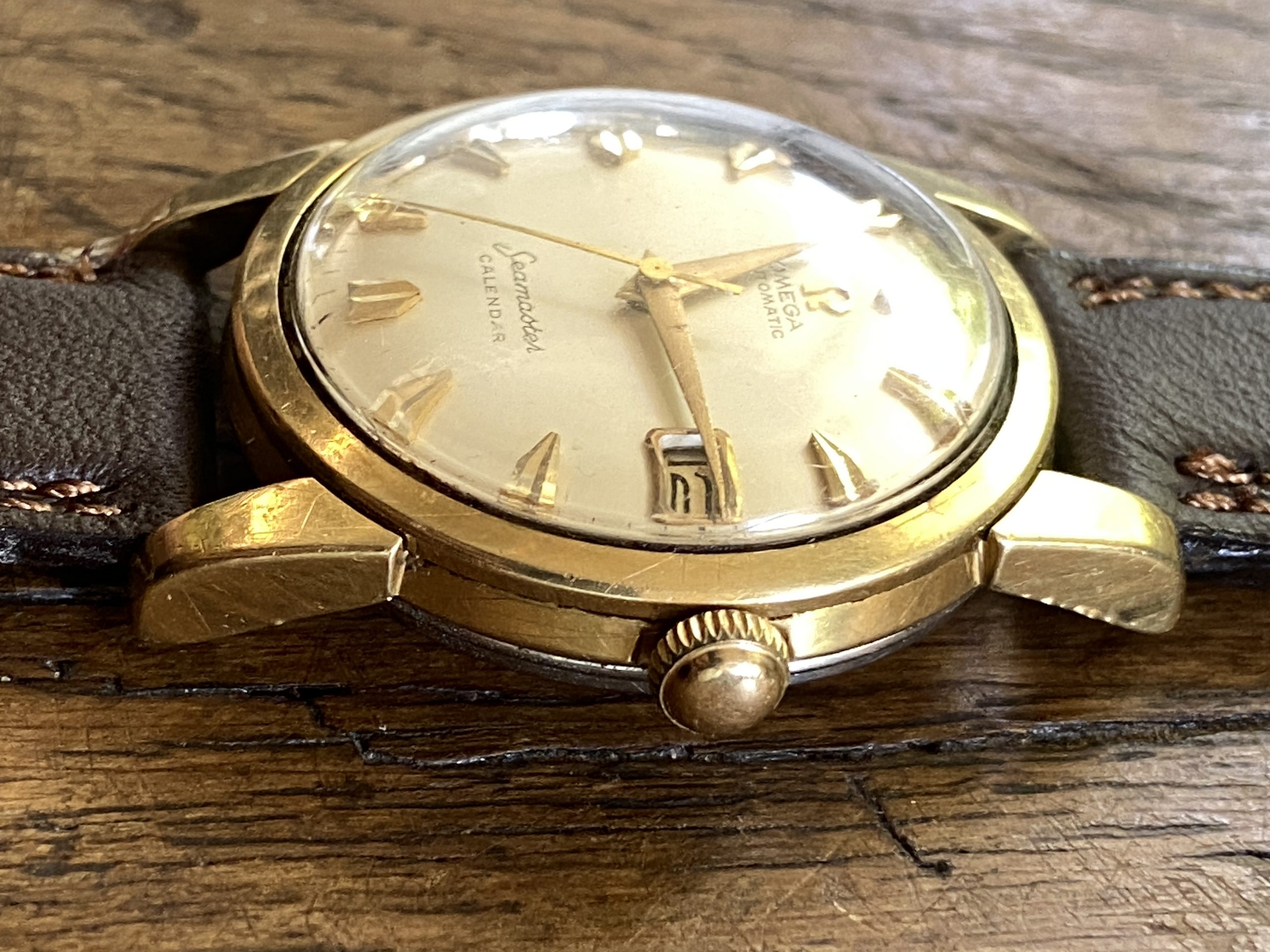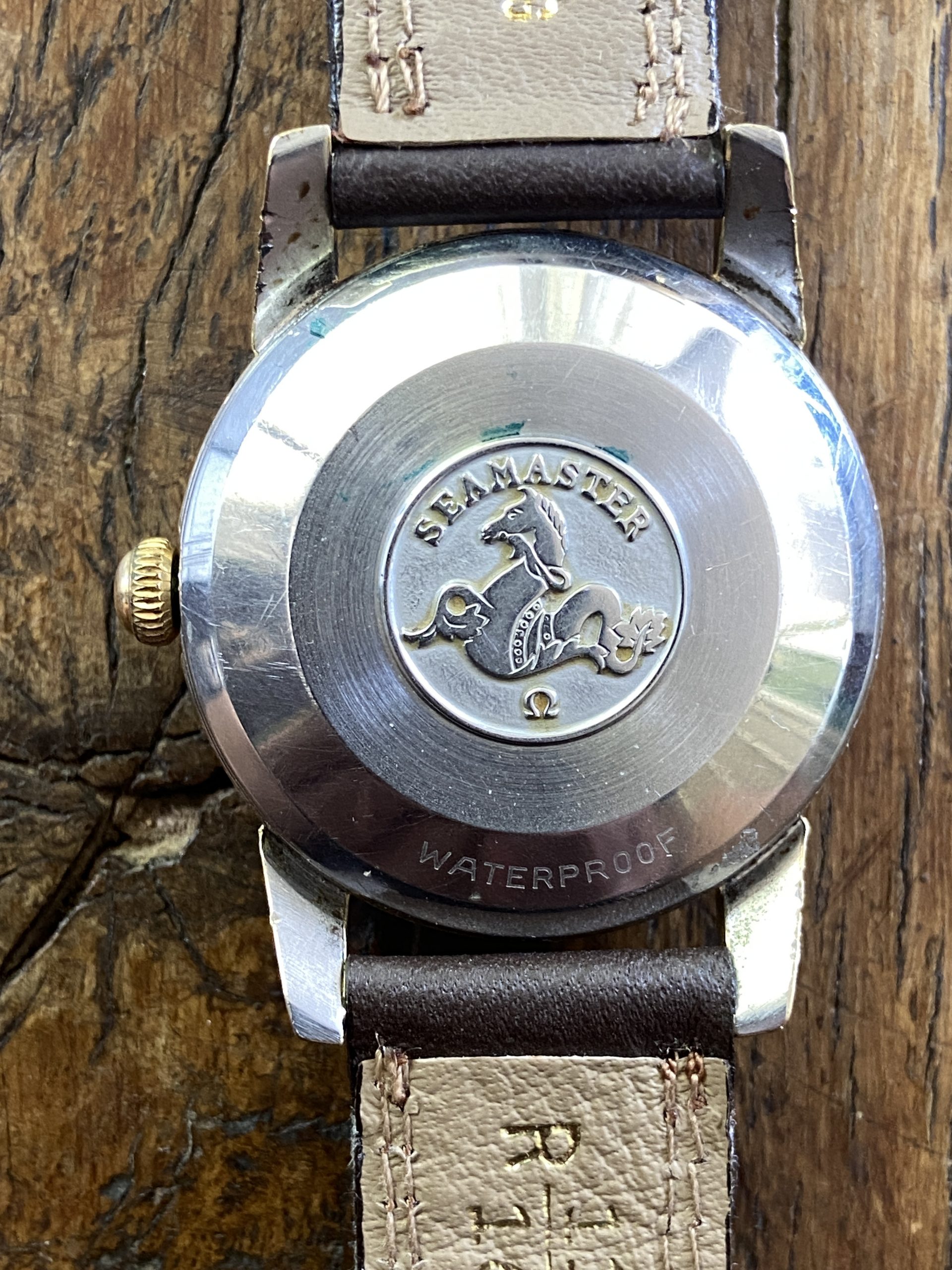This Seamaster is Part of the post-WWII civilian Seamaster line,The Ref 2849 was frequently produced with a “gold cap” (a thick layer of gold over stainless steel) to offer a luxury look at a lower price point than solid gold. This classic watch looks and runs great!